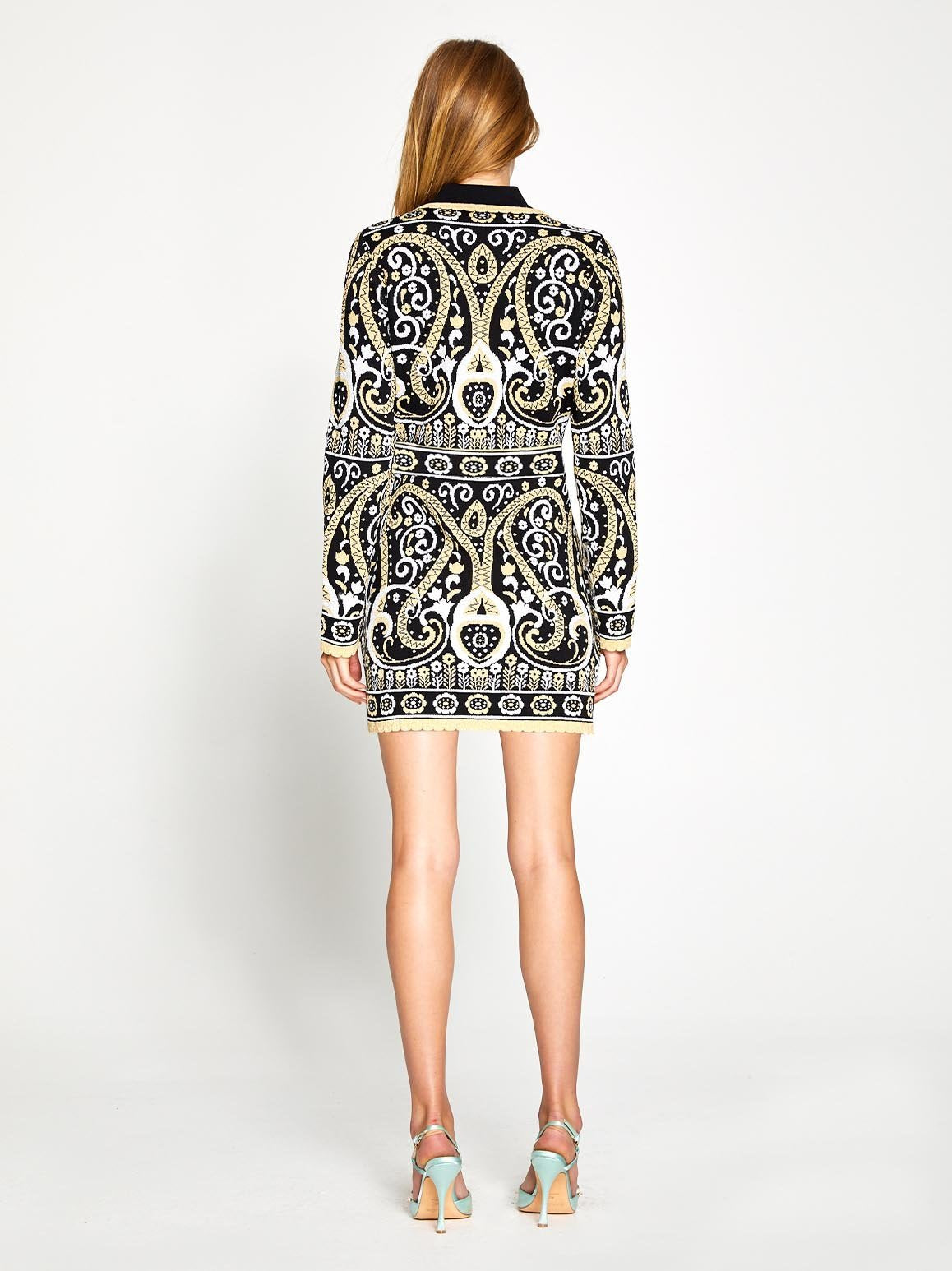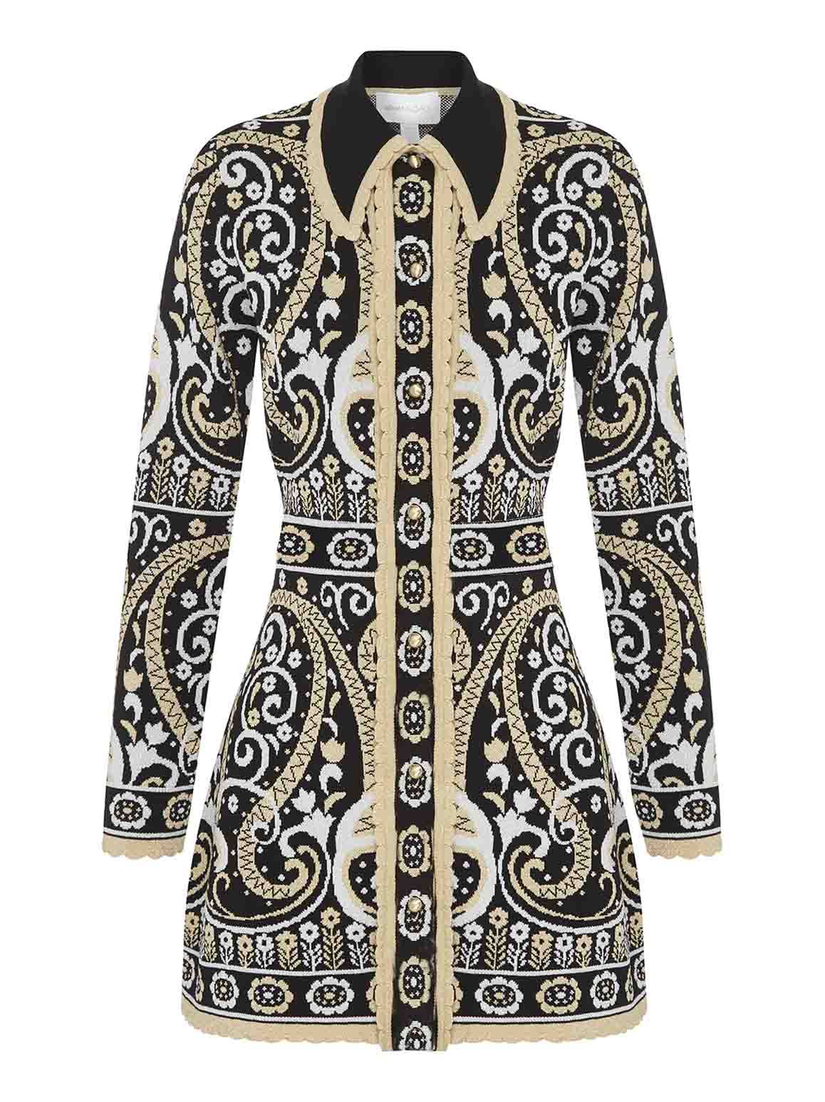 The Adore Jacket has been designed to create a striking statement that accentuates your figure, even in the upcoming cooler months. The vintage inspired collar is finished with delicate scalloped trims and the romantic garden pattern has metallic finishes. This versatile design is lined with buttons and can be worn as a mini dress if desired.