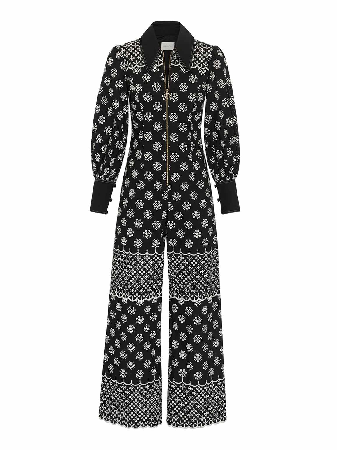 The Angels Jumpsuit offers a cool and striking silhouette that can be worn on vacations and at home. Petal broidere anglaise is used to create different patterns and emphasises the structured cuffs and pointed collar.