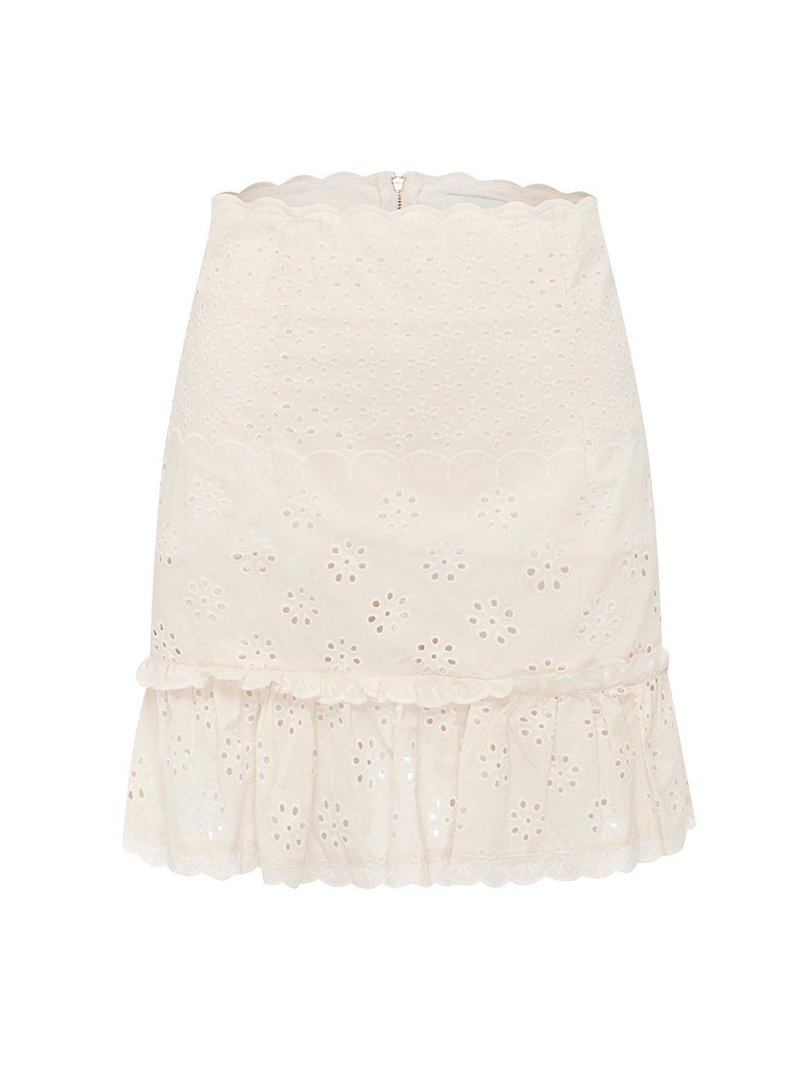 The Angels Mini Skirt will look great on your next vacation with lace up sandals and a bucket bag. This fitted skirt flares out along the hemline and is finished with small ruffles and a scalloped trim. Overlaid with delicate cotton embroidery, this high waisted skirt will be a favourite for years to come.