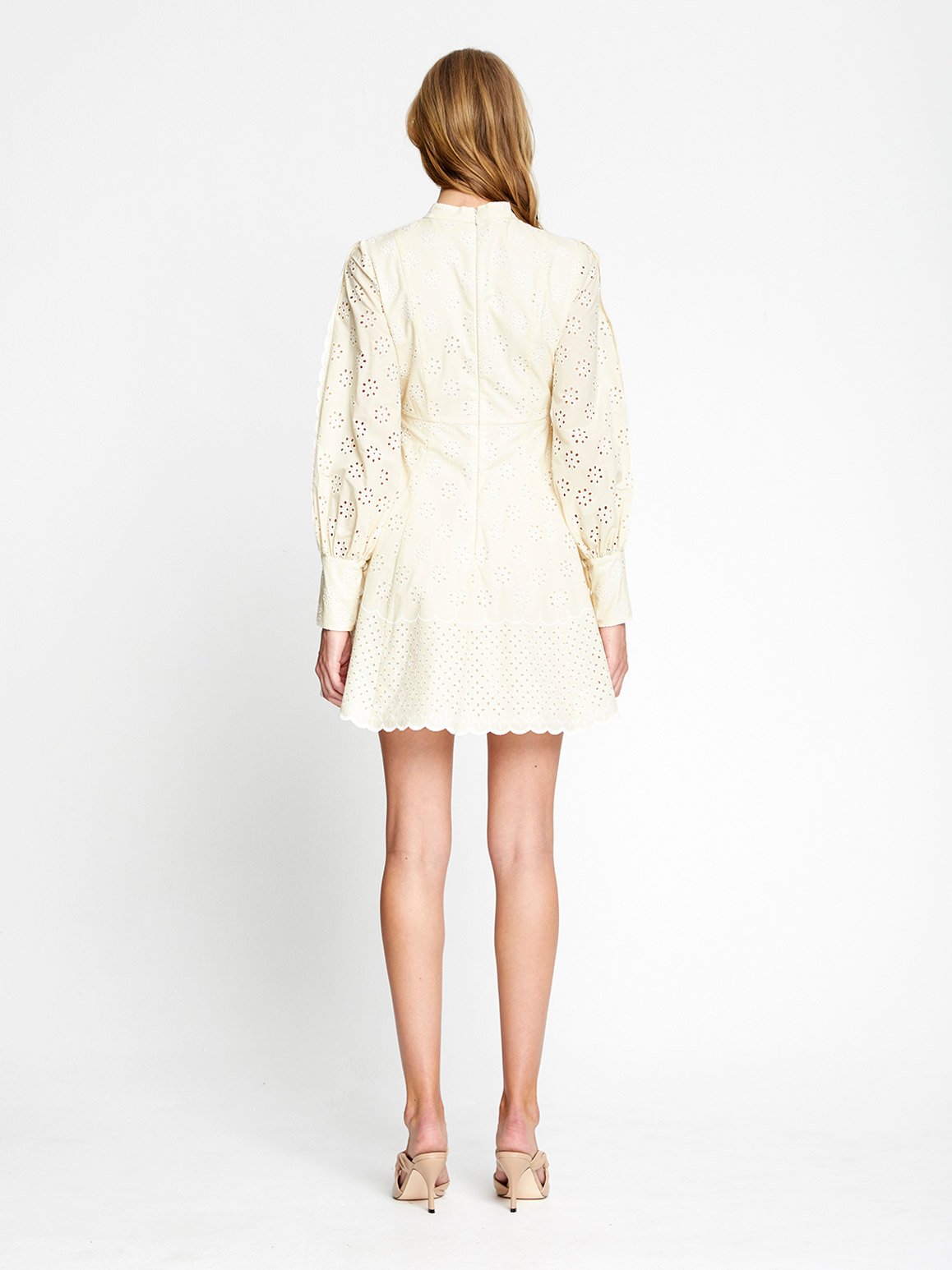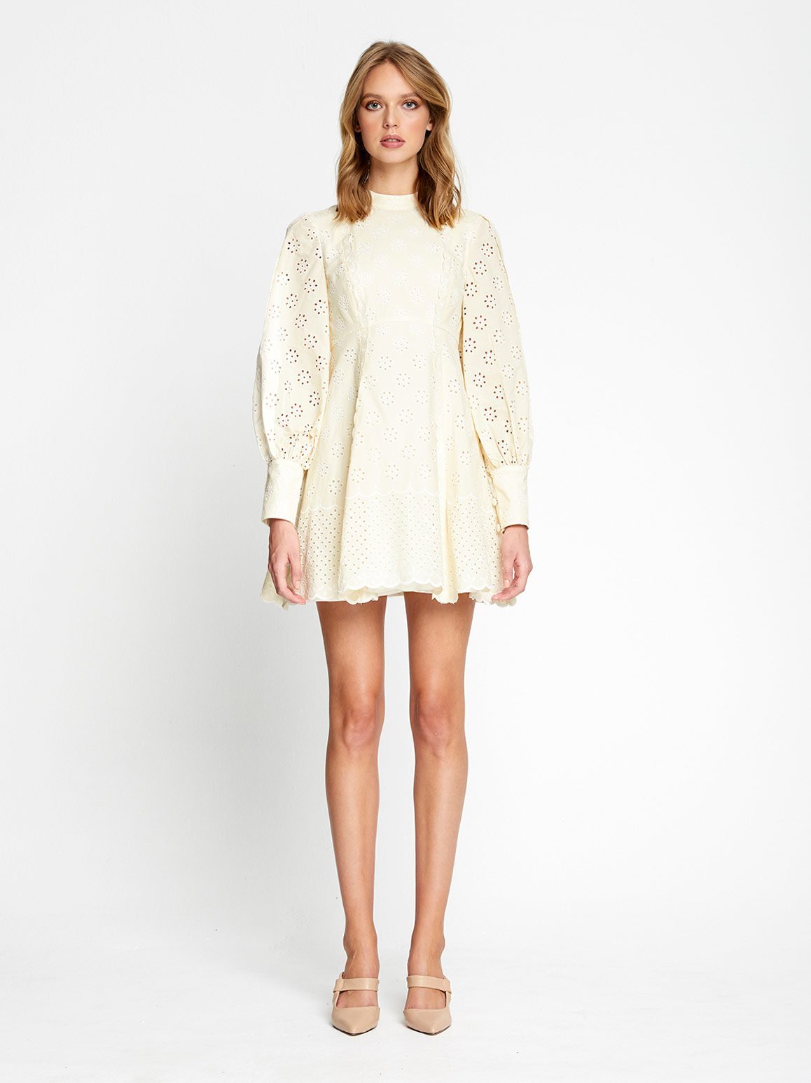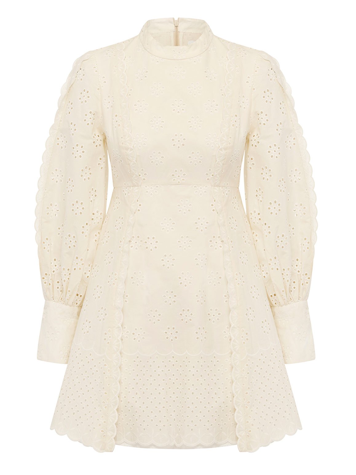 Update your transeasonal wardrobe with the Angels Sleeve Mini Dress. This high neck cotton dress features delicate floral embroidery and oversized cuffs, finished with 3 matching buttons. Compliment the fit and flare feminine silhouette with open toe heels.