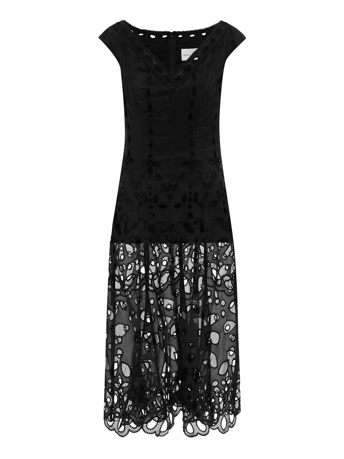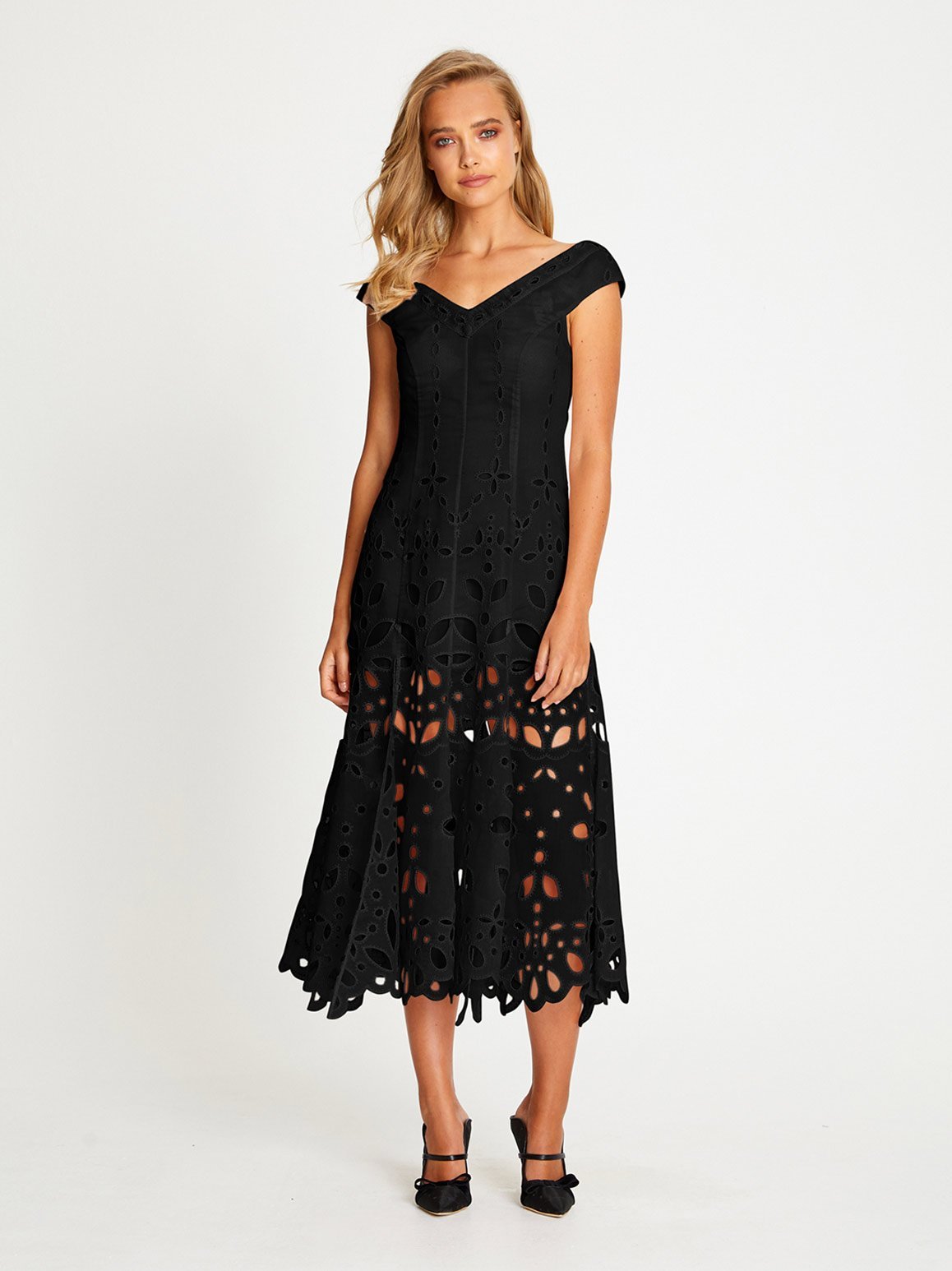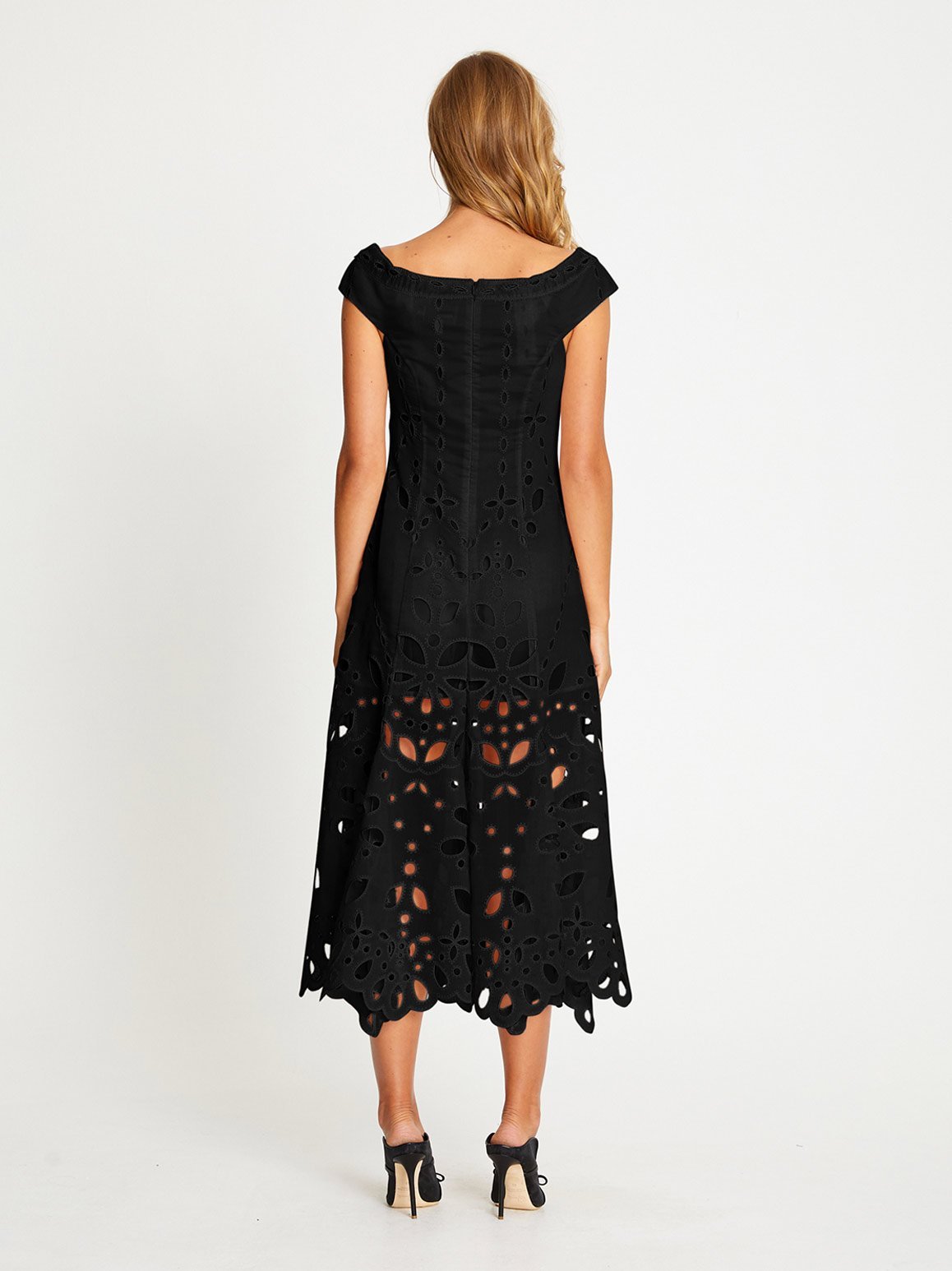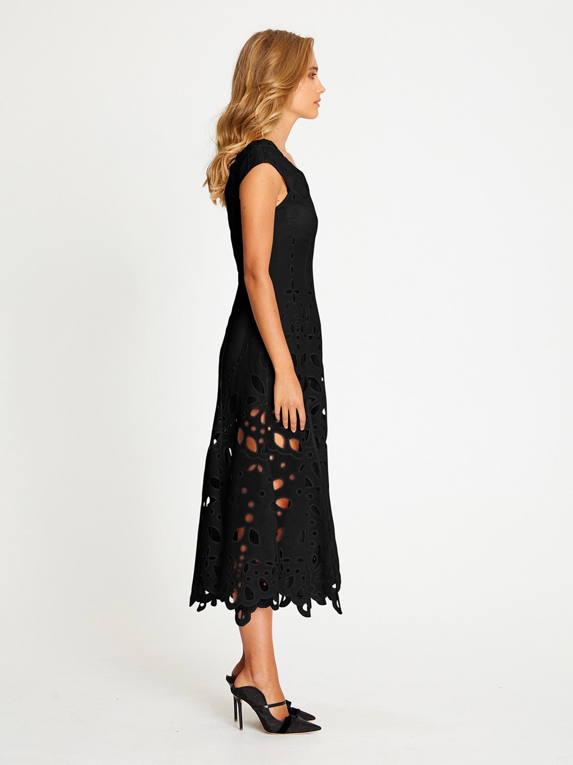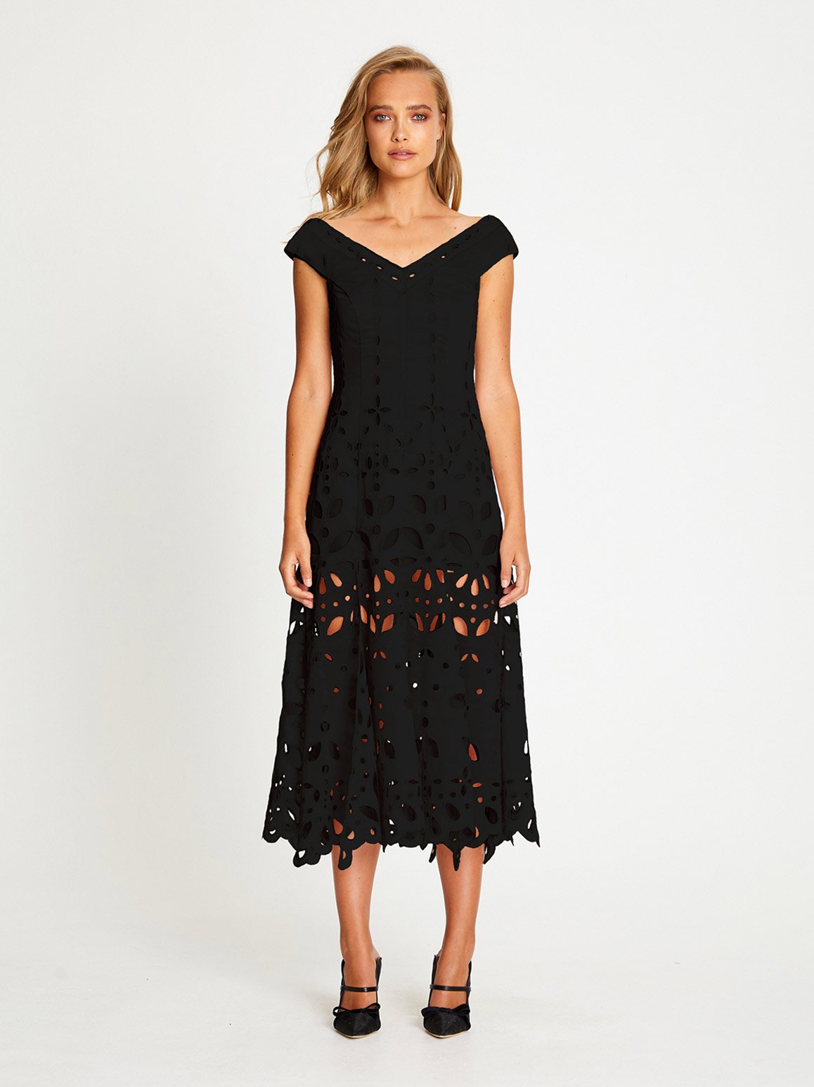 The Baudelaire Midi Dress offers a traditional silhouette, decorated in teardrop embroidery to create the illusion of boning. Transitioning to a sheer skirt, this feminine midi dress balances modesty with modern features. Style with some mules and wear to a luncheon.