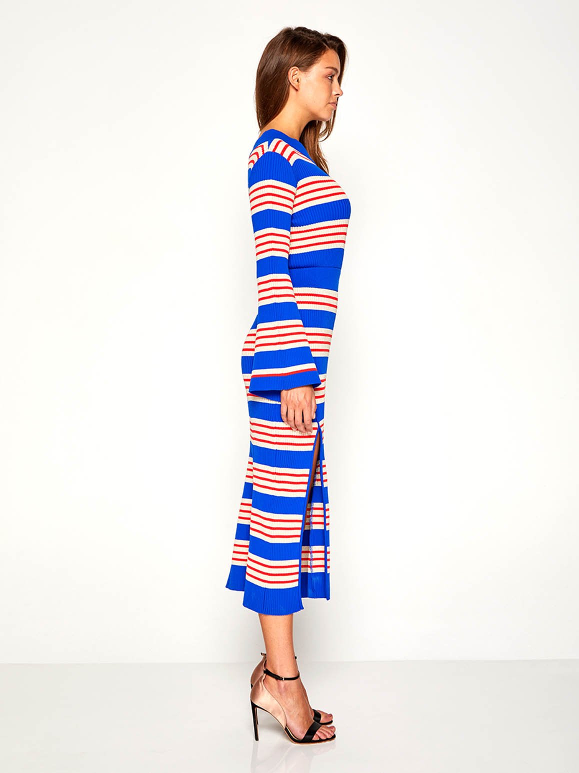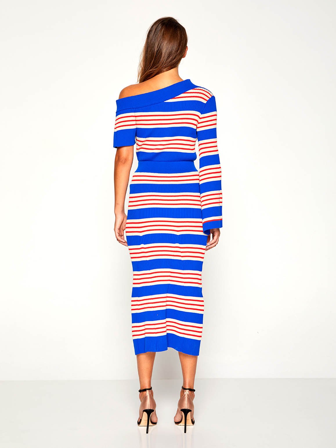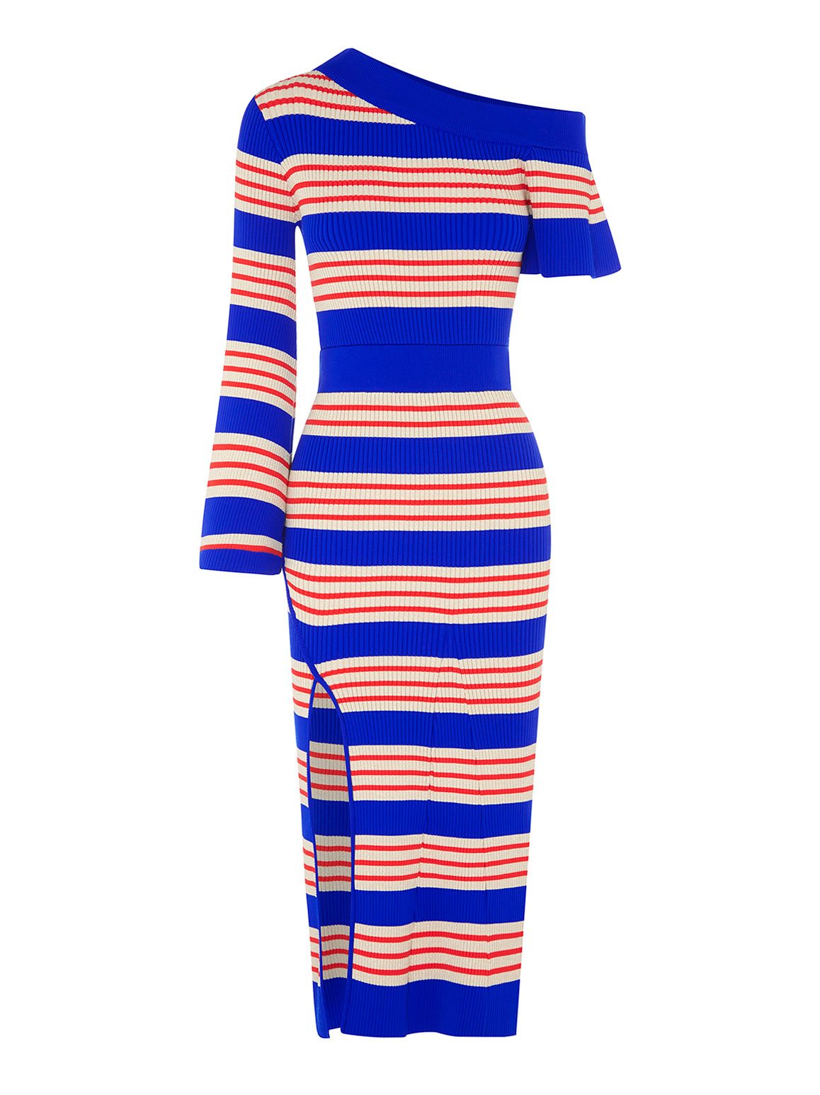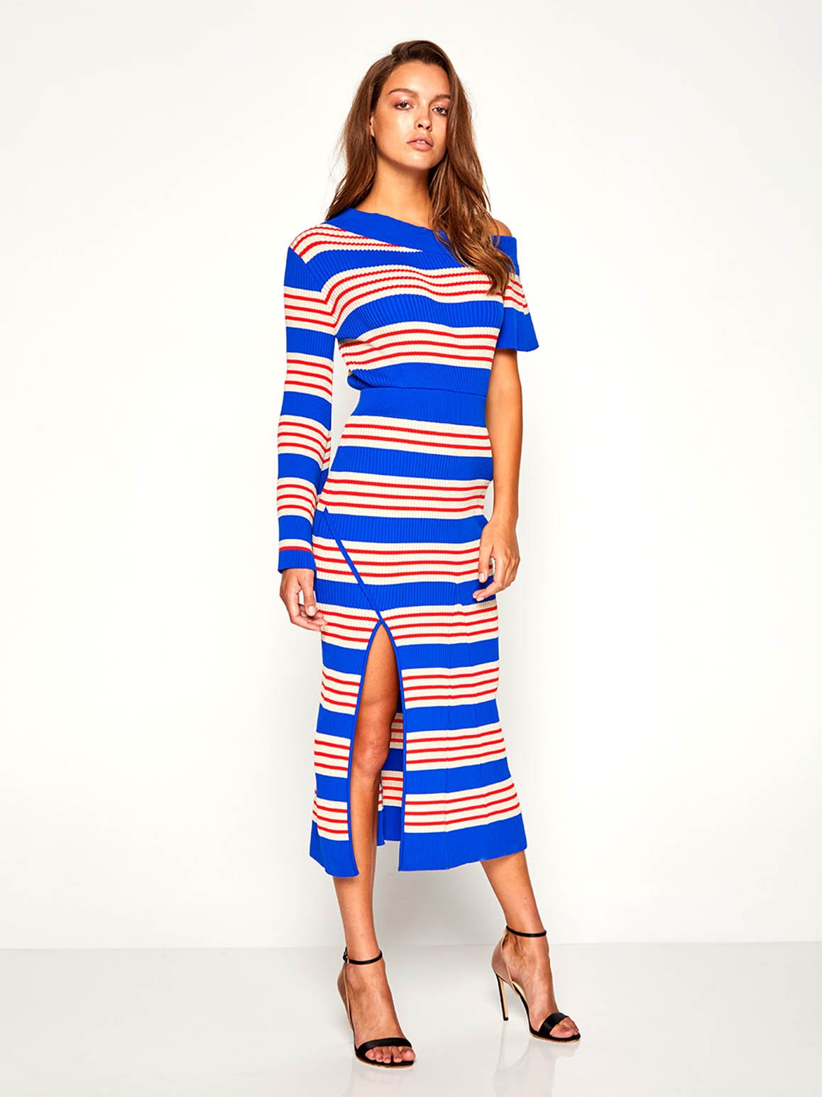 Mixing elegance and ease, The Bel Air Dress is knitted with cobalt blue, red and sparkly stripes in a midi length design. The sweeping neckline and different lengthed sleeves give this dress its point of difference. Style with heels to make your legs appear longer while peeking through the thigh high split.