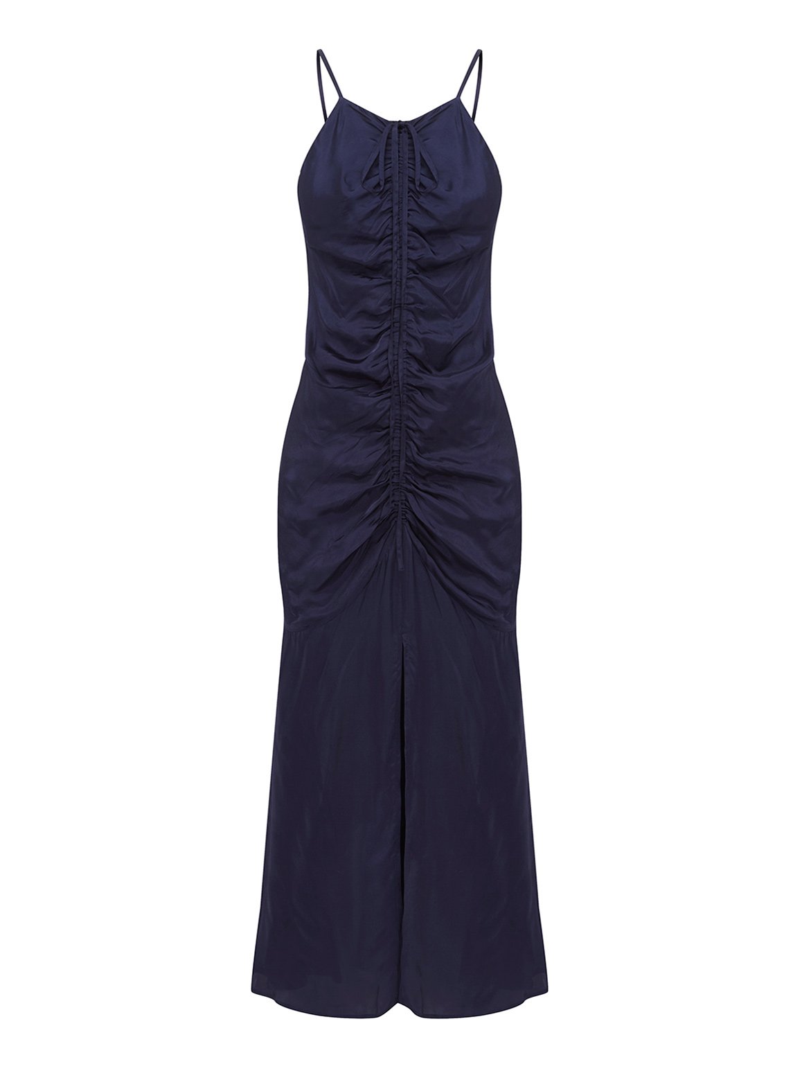 Cut in a classic slip dress silhouette, the Blue Moon Midi Dress has been dramatically gathered towards the centre with a drawstring tie so you can adjust for a desirable fit. Cut from a lush satin fabric, this midi dress falls to a slightly fluted hem that has a front split for easy movement. Pair back with simple strappy heels for a minimalistic look and feel.