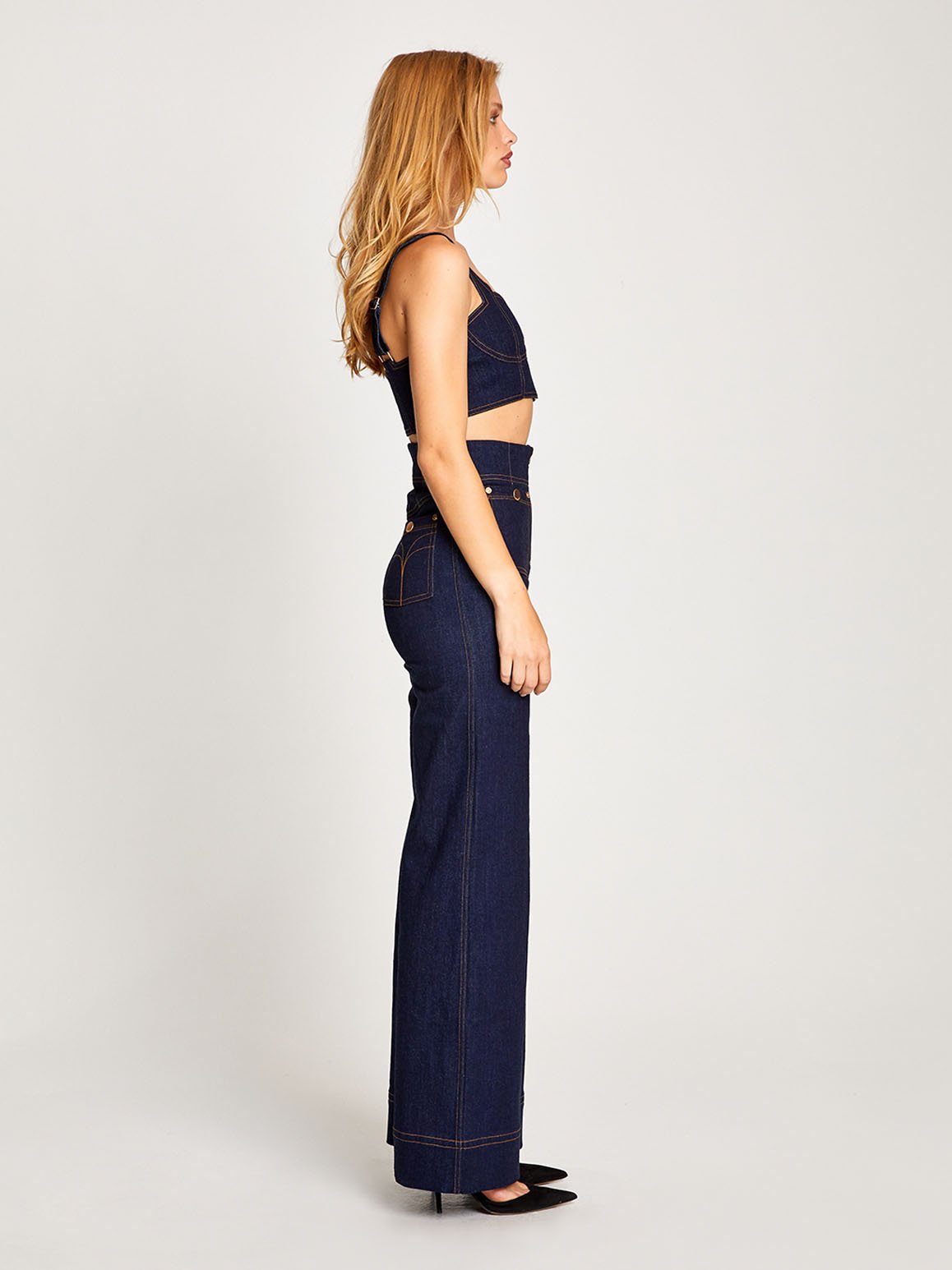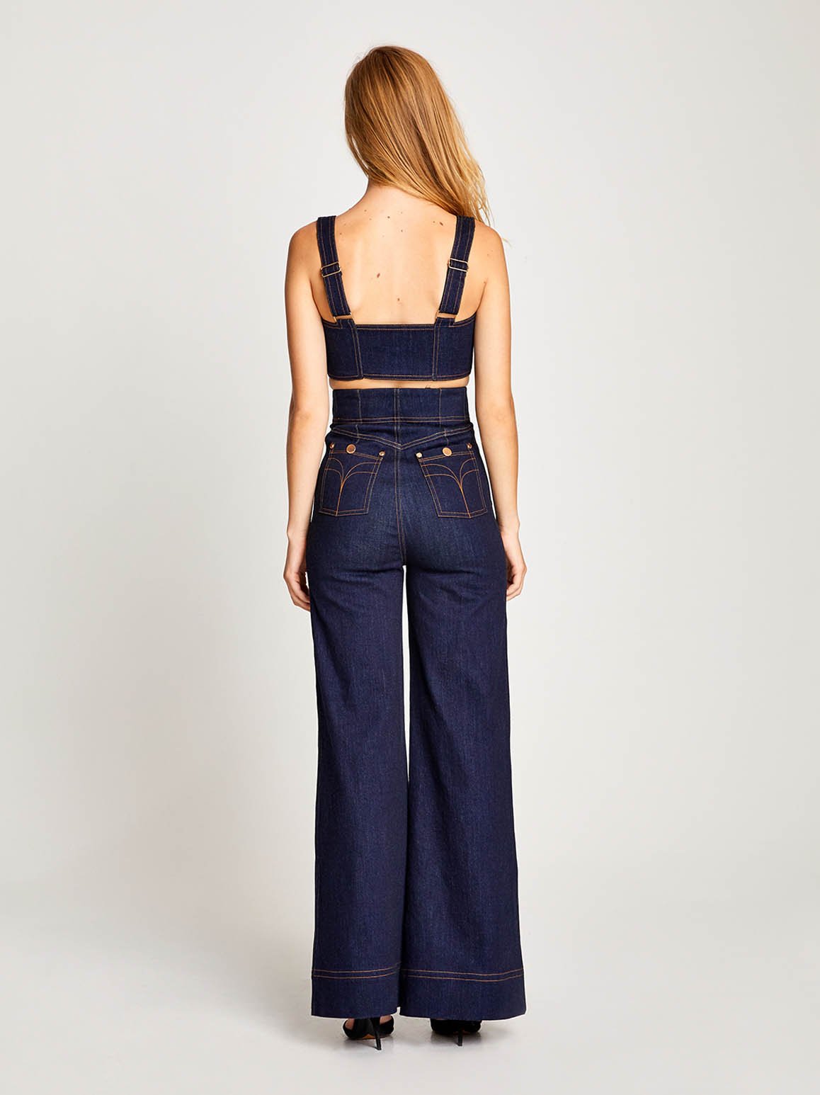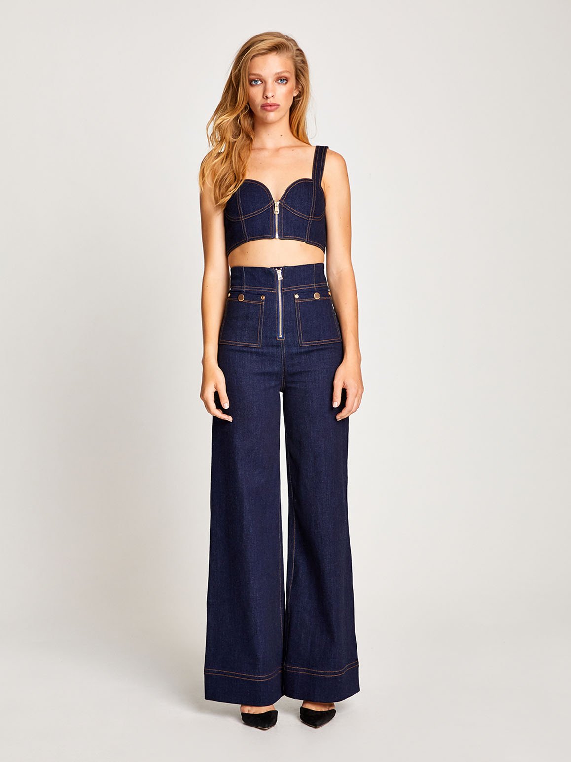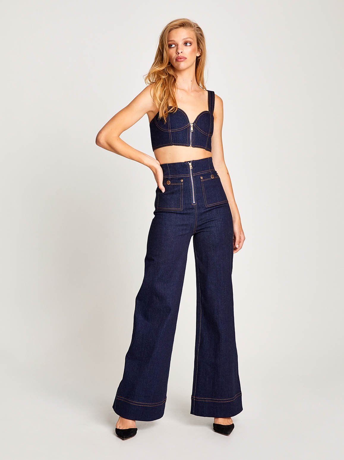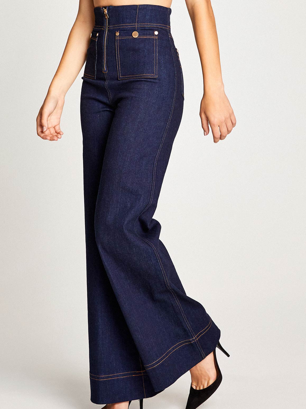 The Azure Bluesy Jeans are cut from a stretch denim to shape and form to your body. This style sits firmly at the waist, shaping over the hips and into a wide leg to create a balanced shape. Metal hardware adds detailing to this style, so tuck in a cute cami and you're ready to go.