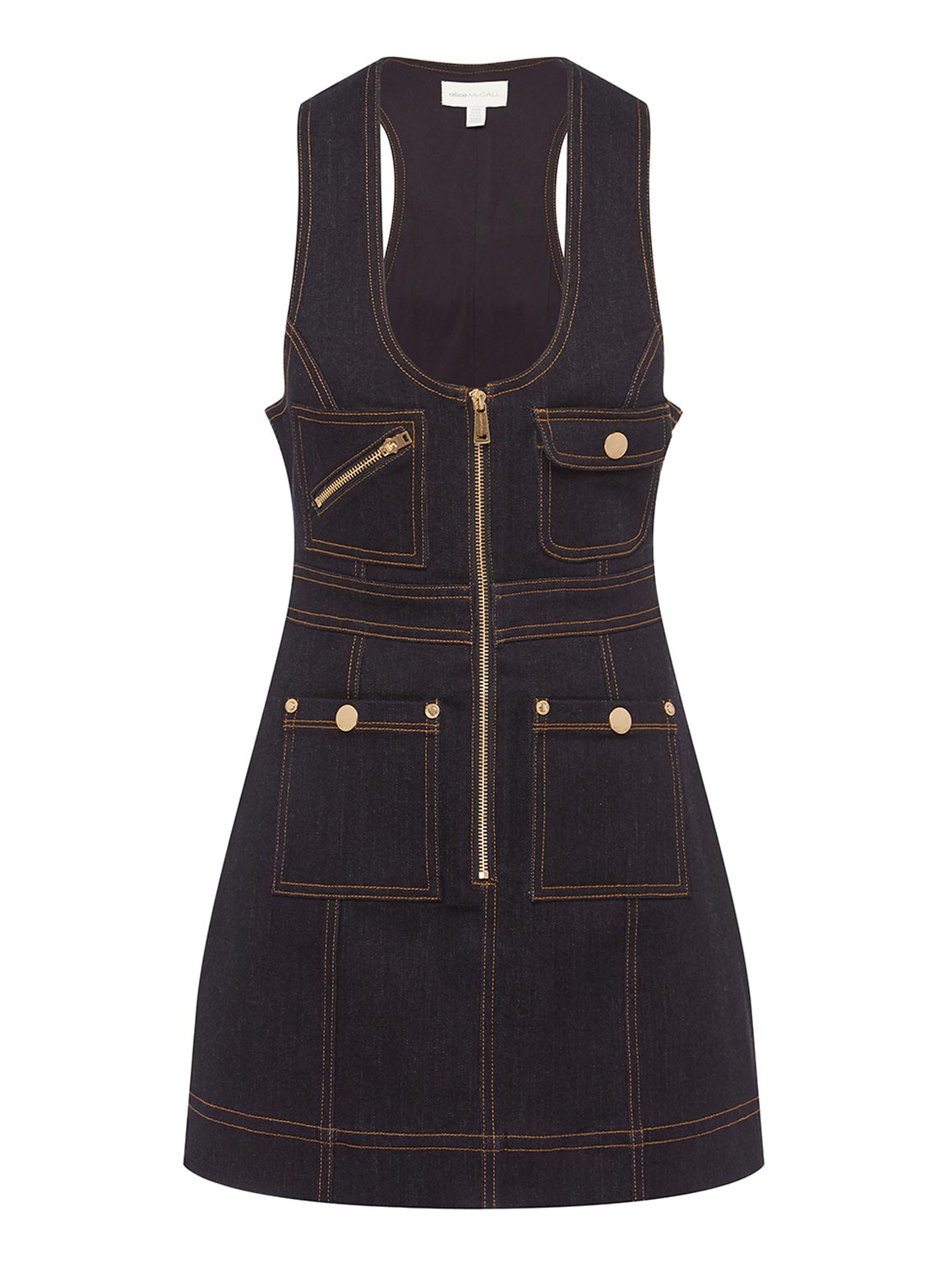 No alice McCALL collection is complete without staple denim. The Club Noir Mini Dress can be worn out at night with some heels or during the day with strappy sandals. It has a scooped neckline and gold metal hardware on the pockets.