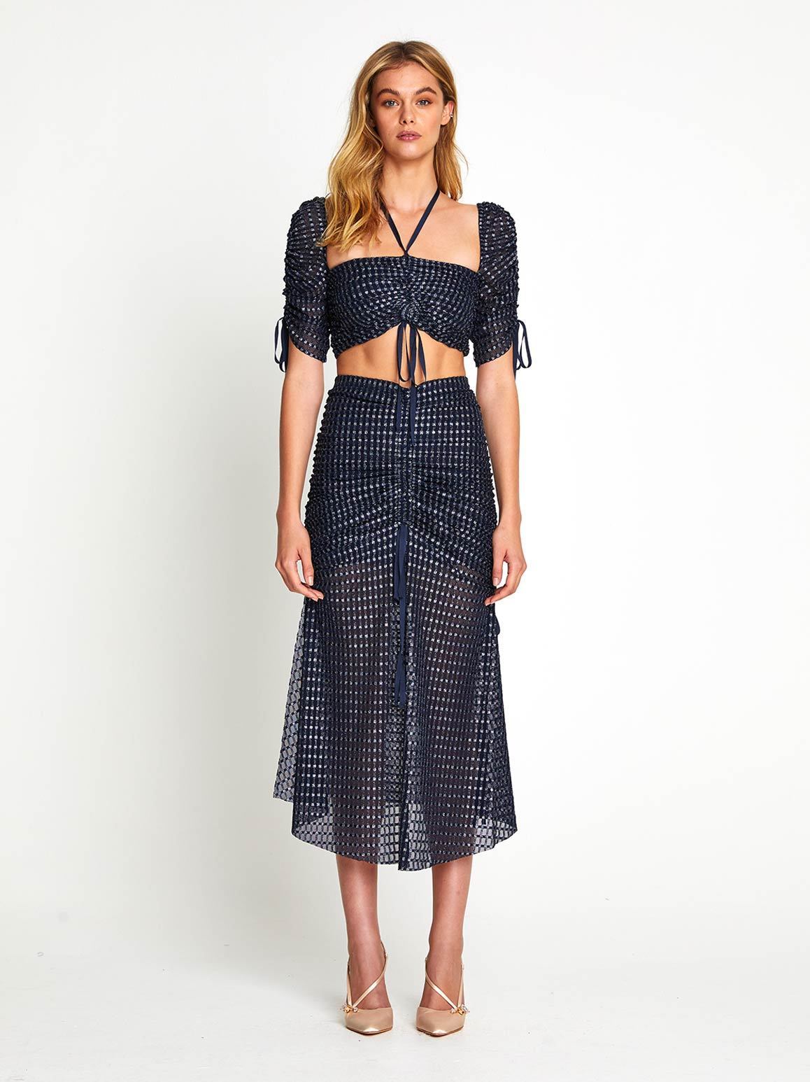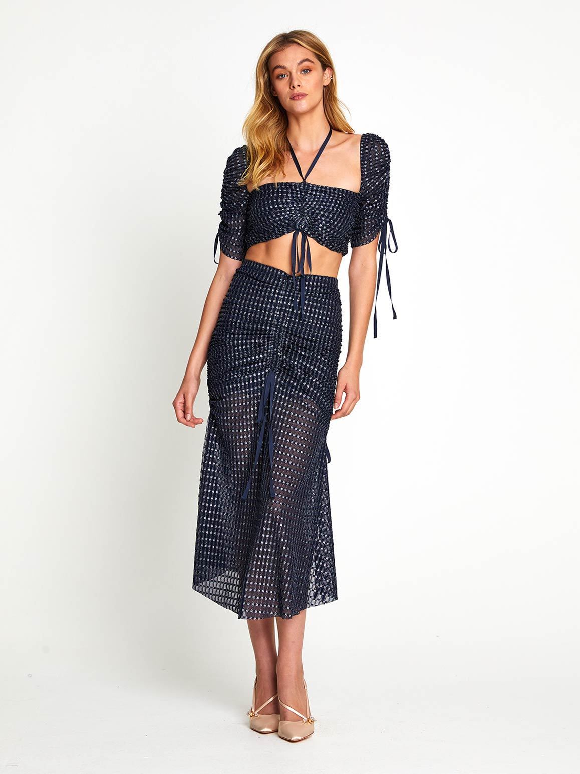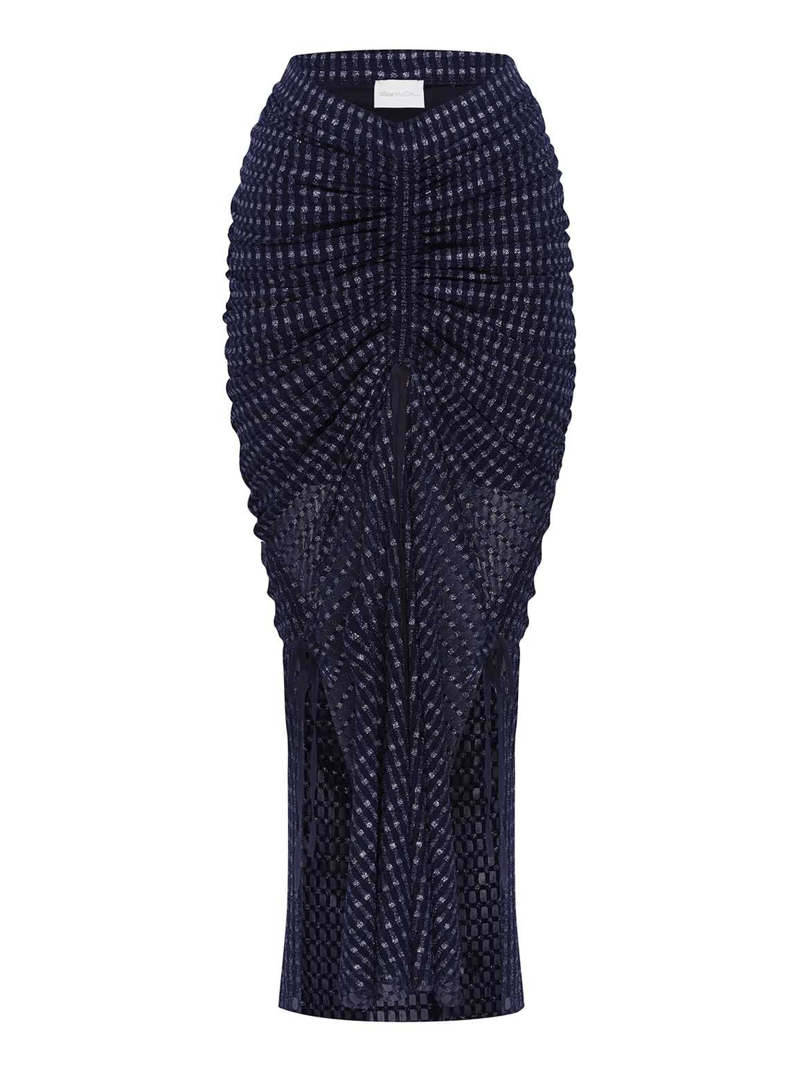 The Cold Karma Skirt is a ruched metallic midi skirt with an exaggerated drawstring at the centre front. Another styles that incorporates glitter, it has 2 side splits and an elasticated waistband. You can dress this down with a white tee and sneakers.