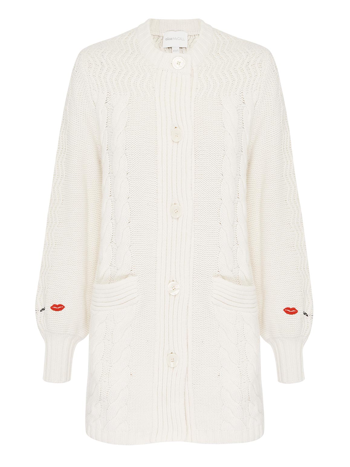 Woven from a cable knit, the Constance Cardigan is a classic staple for your winter wardrobe. The playful french embroidery on the sleeves is the sweetest touch to the otherwise neautral palette. Complete with 2 front pockets, the cardigan is fastened with oversised buttons down the centre front.