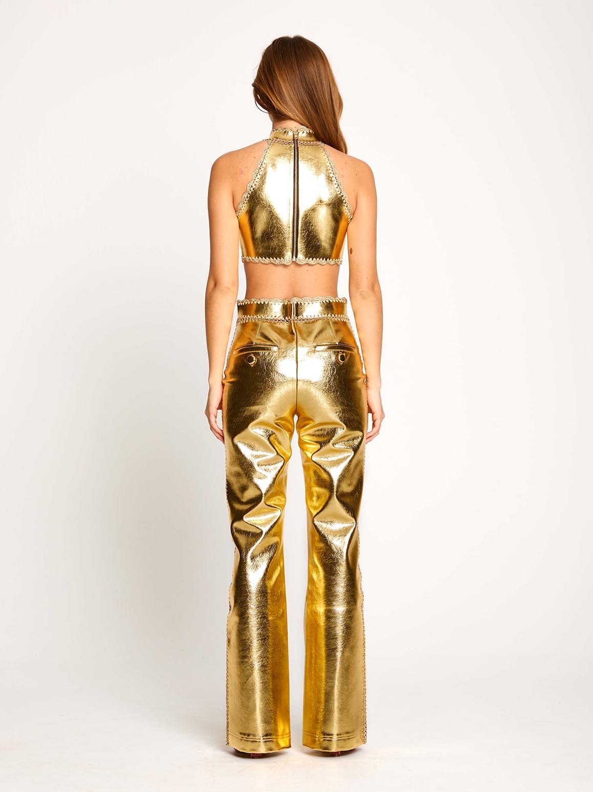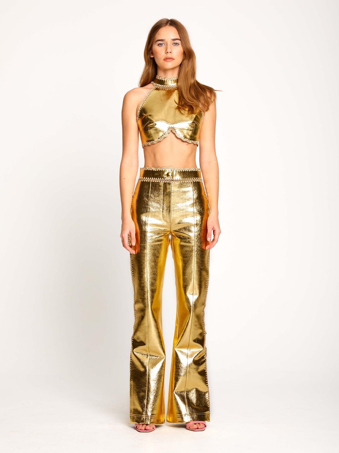 Cut from supple leather and finished with a metallic foil, the Cool Cat Pant transports you back to the 70's. These inventive pants have crochet trims and will be sure to create a statement over the festive season. The high waisted fit emphasises the small of your waist and falls to a slight flare at your feet.