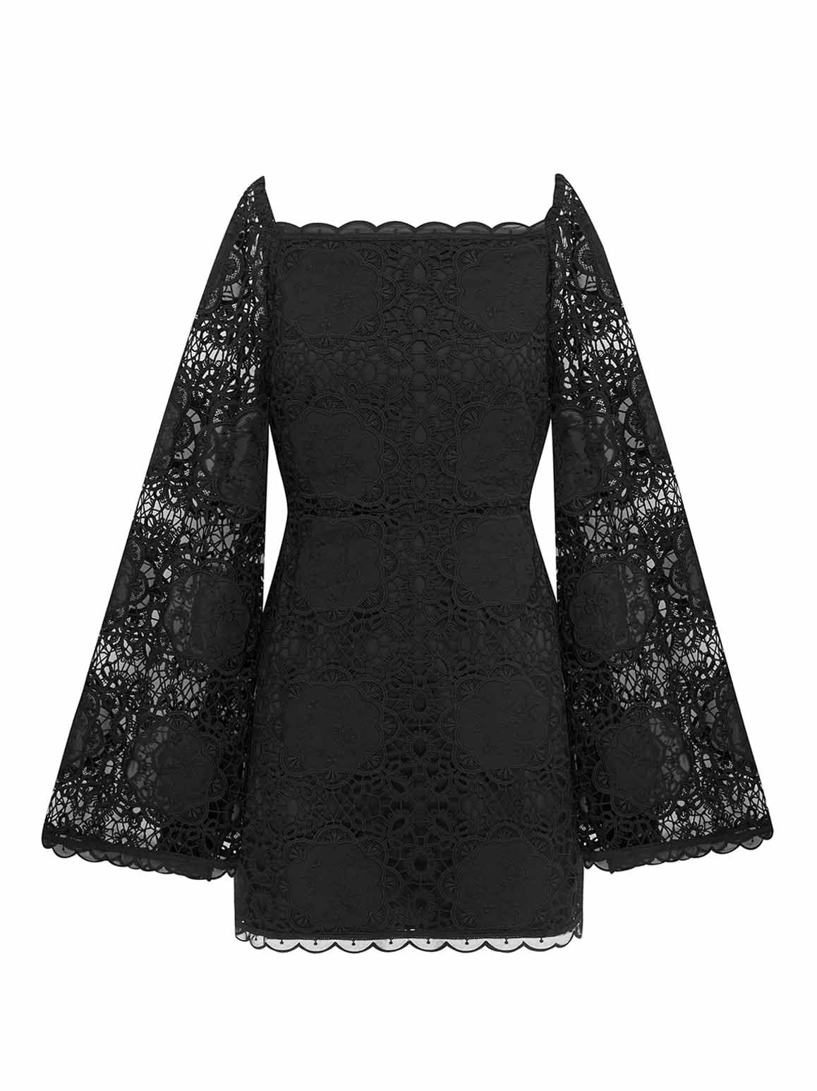 The Diamond Mini Dress gives you an effortlessly chic look that combines 60's silhouettes with 70's patterns. Cut from a vintage doily lace, this darling dress has scalloped trims and a high square neckline. Take a tip from our shoot and leave your hair out with some soft waves.