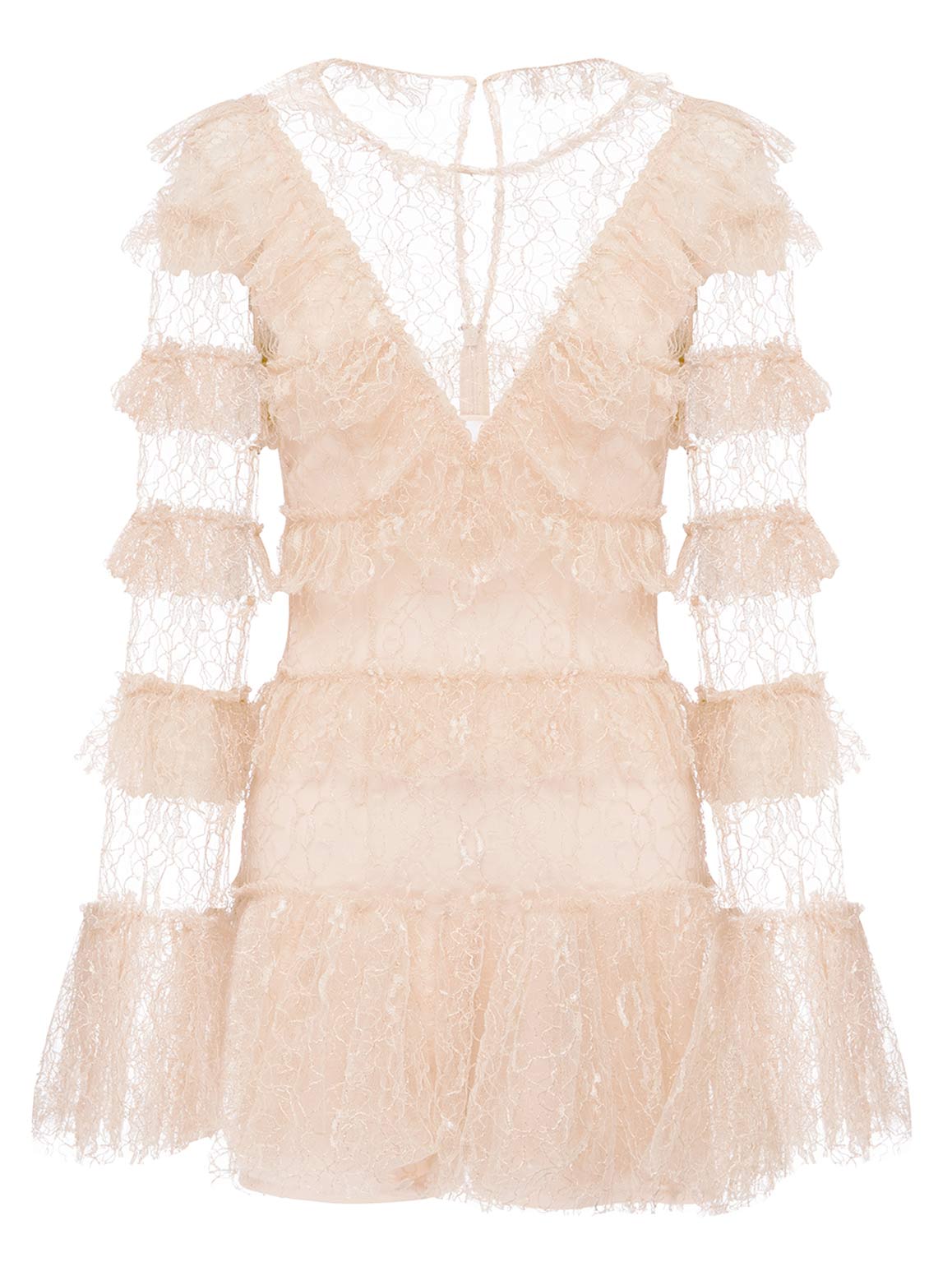 Our best selling Zen Dress is back in a new foiled lace! Raw cut ruffles line the low V-neck shape whilst the sheer fabric covers your décolletage and finishes high on the neck. This mini dress has been lined with a detachable mini dress slip in a tonal hue.