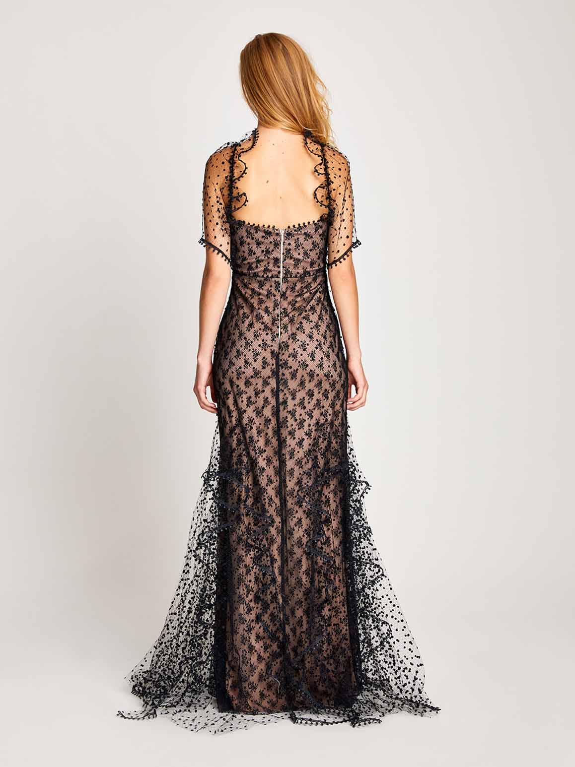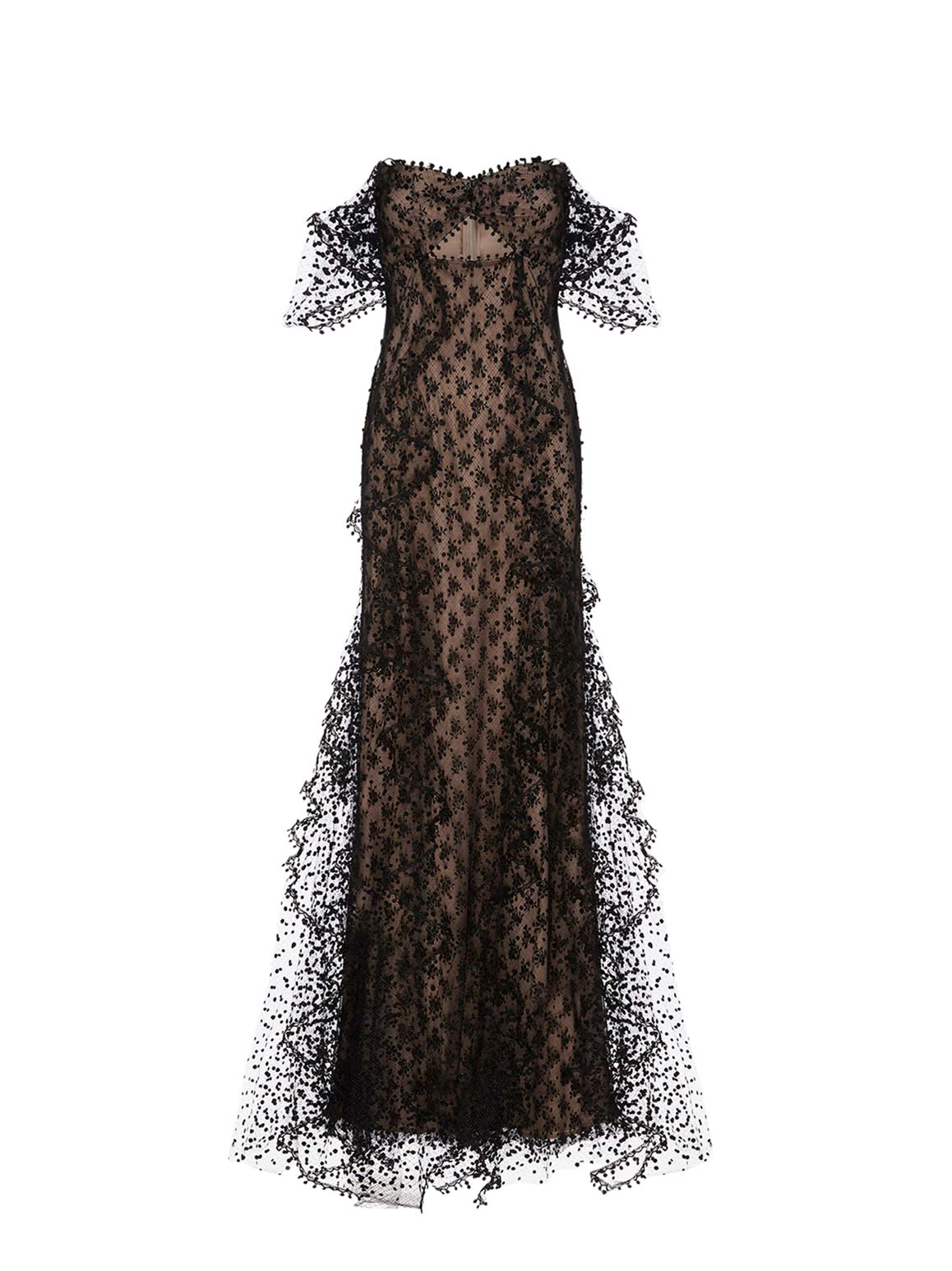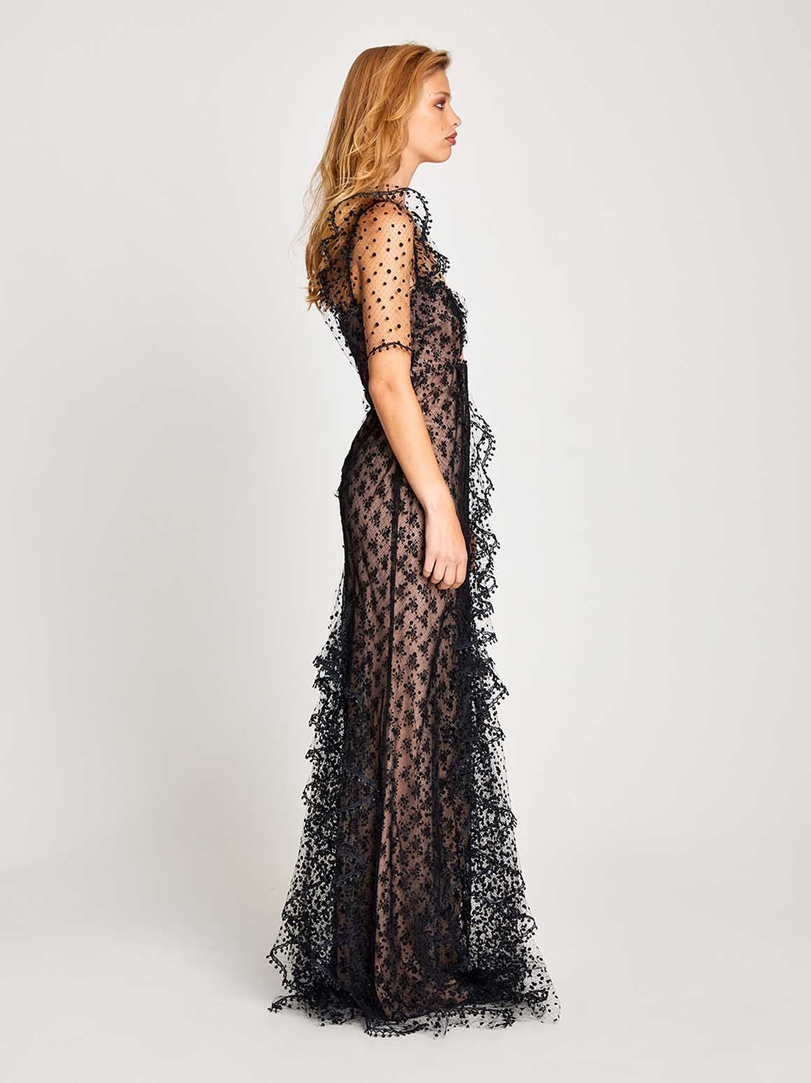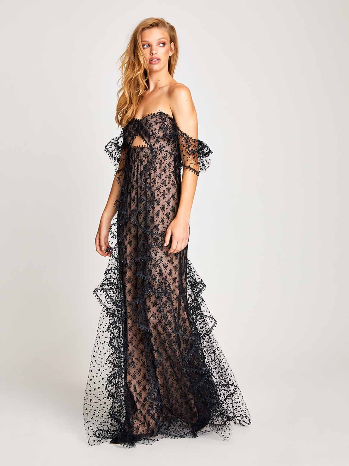 The Found You Gown is a maxi dress that falls at just the right length to sweep across the floor while you dance. The outer layer has been constructed from an embroidered mesh lace with vertical ruffles that cascade down the dress. Temper the long length with your highest pair of heels.