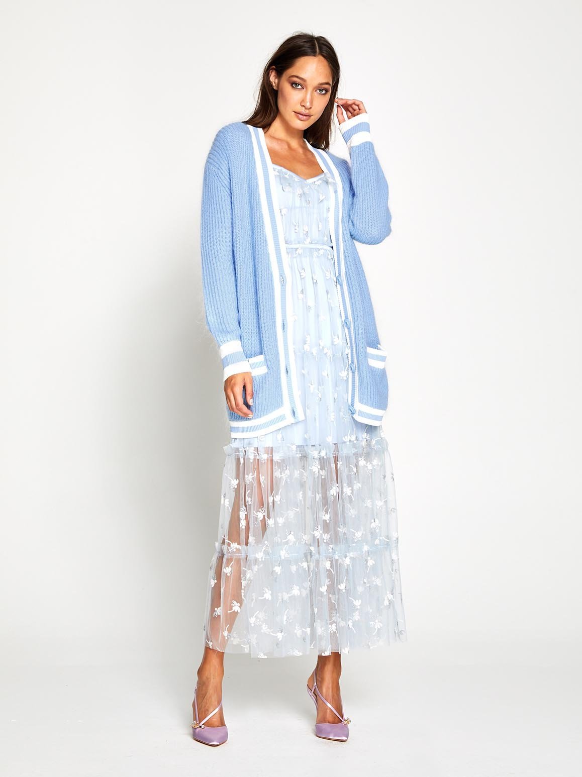 Whether you're cosying up next to a fire or grabbing your morning coffee, this fluffy knit will be your go-to in the colder months. The Get The Blues Cardigan is an oversized fluffy sports knit that features striped trims. To maintain the minimalistic feel, we recommend layering this over a white shirt and jeans.