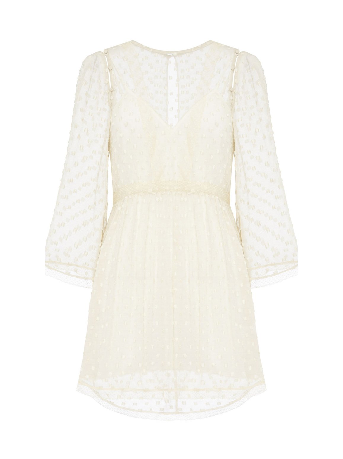 Constructed from a weightless chiffon jacquard, the Gidget Dress is the perfect mini dress for all occasions. Featuring 3/4 fluted sleeves and detailed with a delicate spotted lace trim, this silhouette nips in at the waist and then brushes over the hips in a floaty, playful skirt. Buttons on the shoulder allow you to wear the sleeves two different ways.