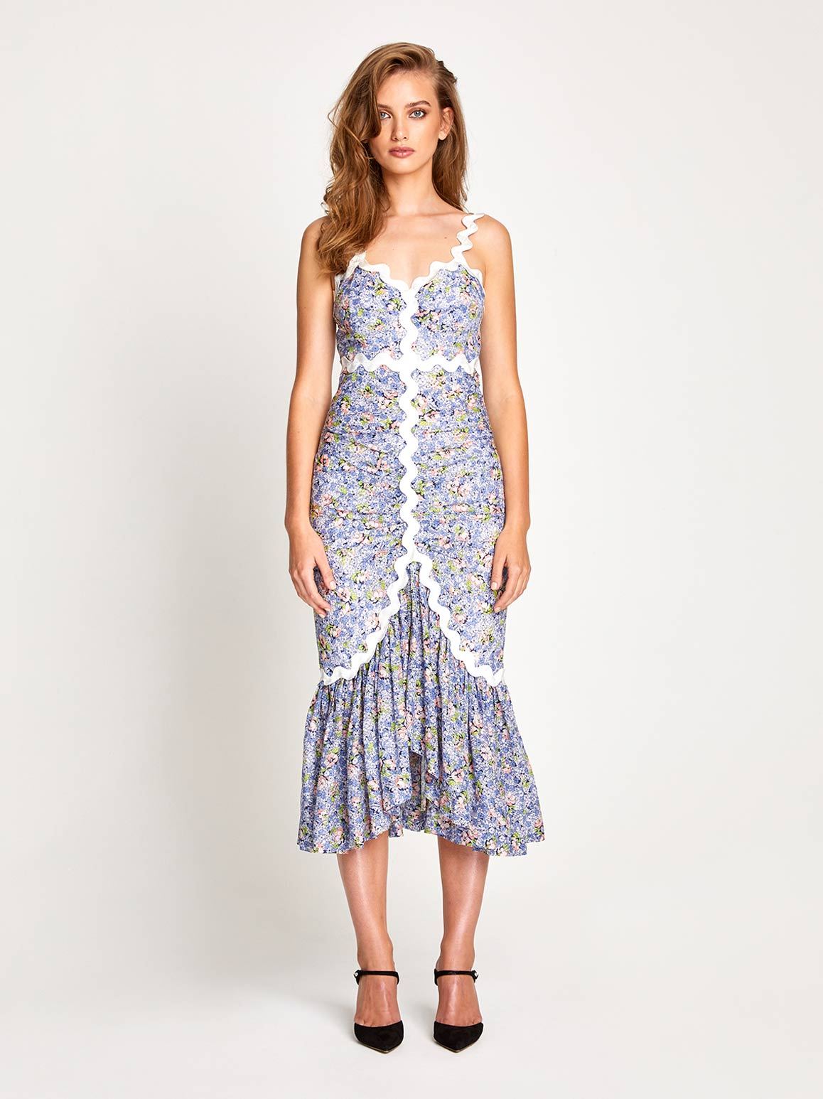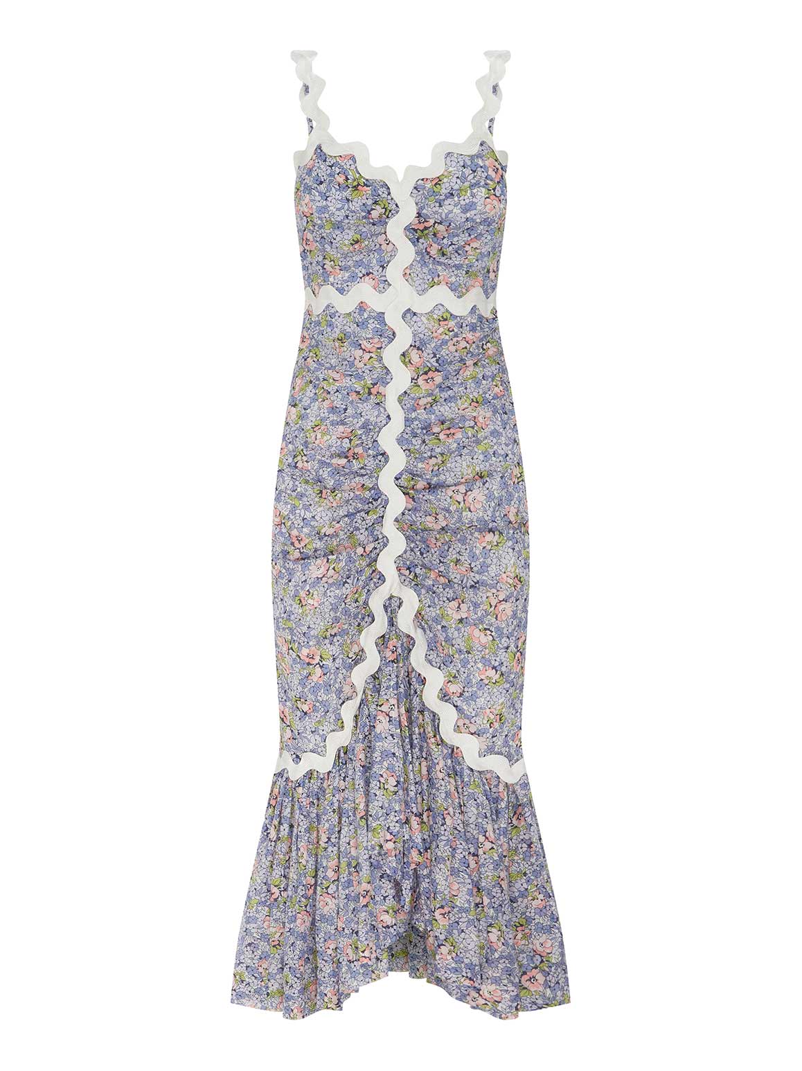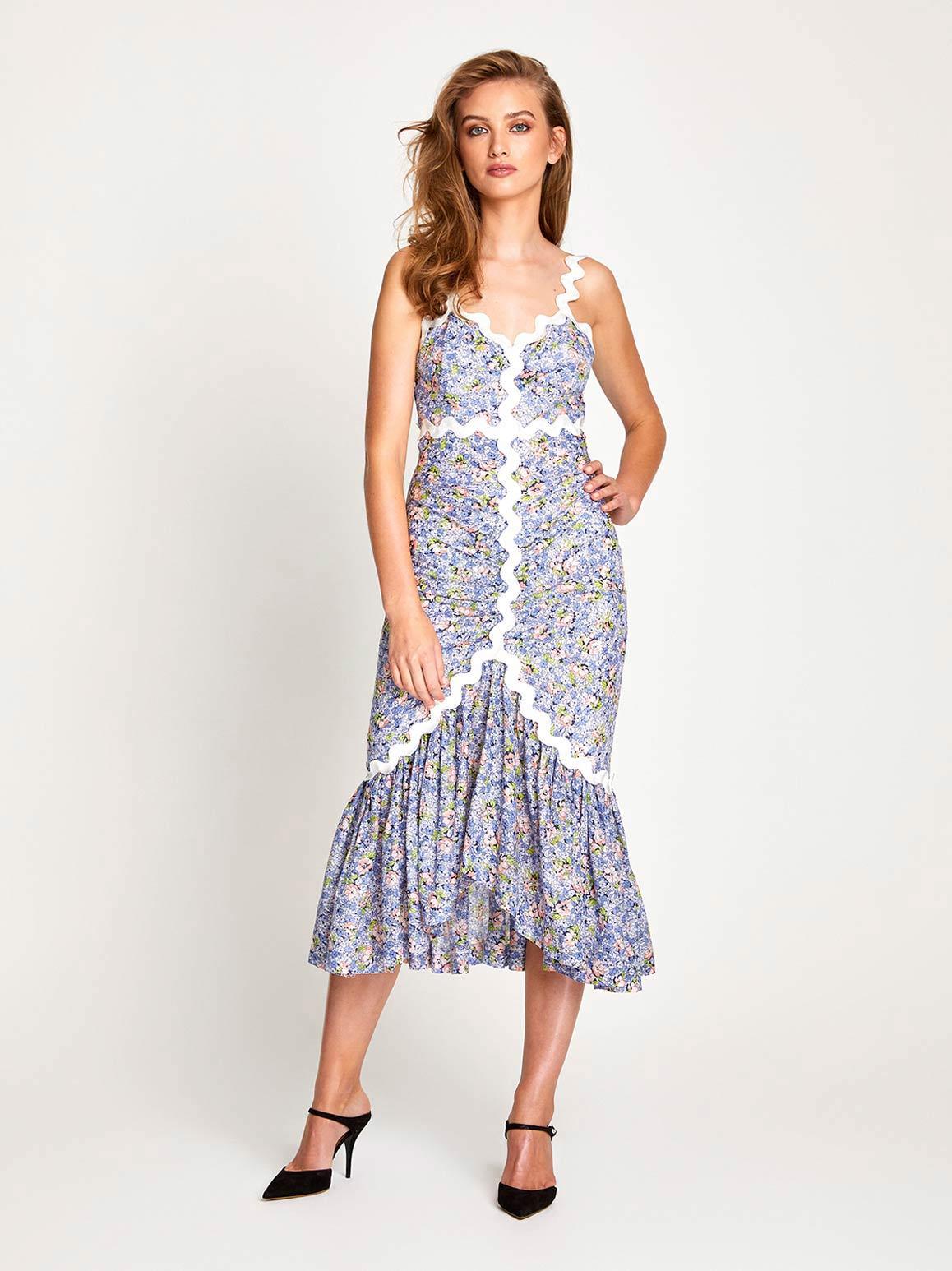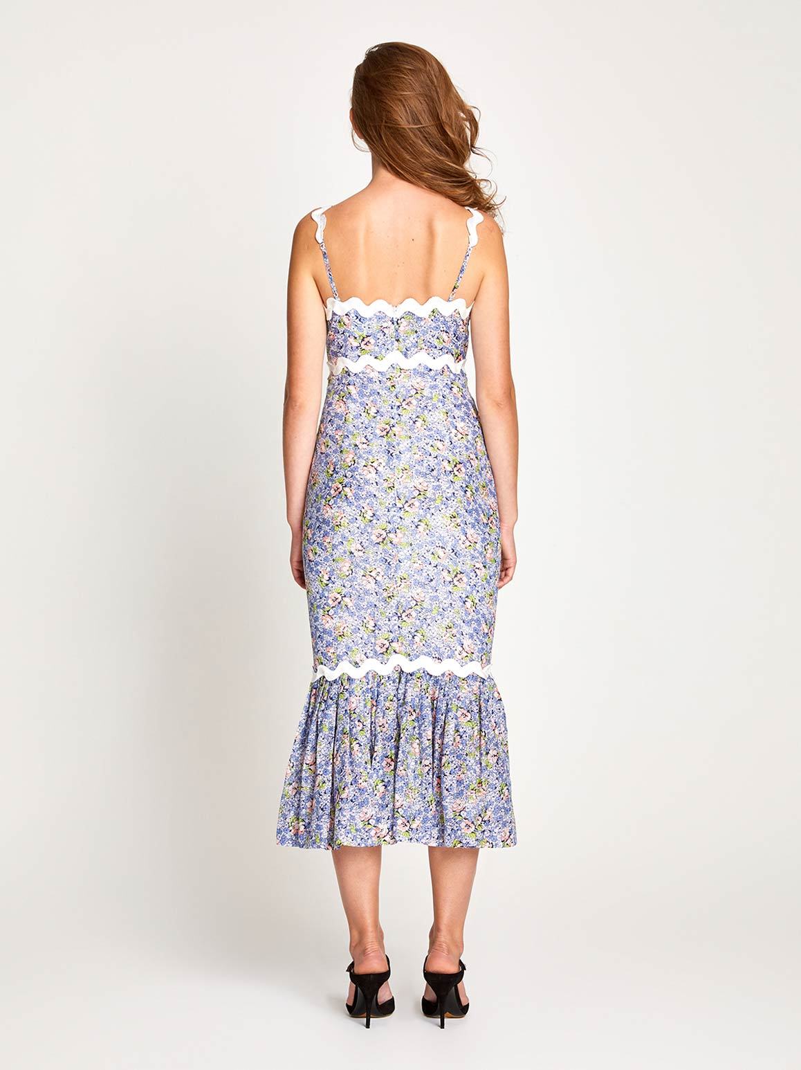 The Lady Midi Dress a modest design perfect for a wedding or garden party. White zig zag trim is used to define your shape and balance the saturated lavender print painted across the dress.