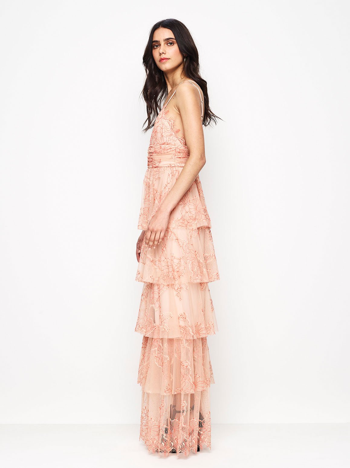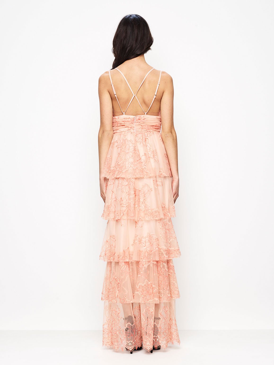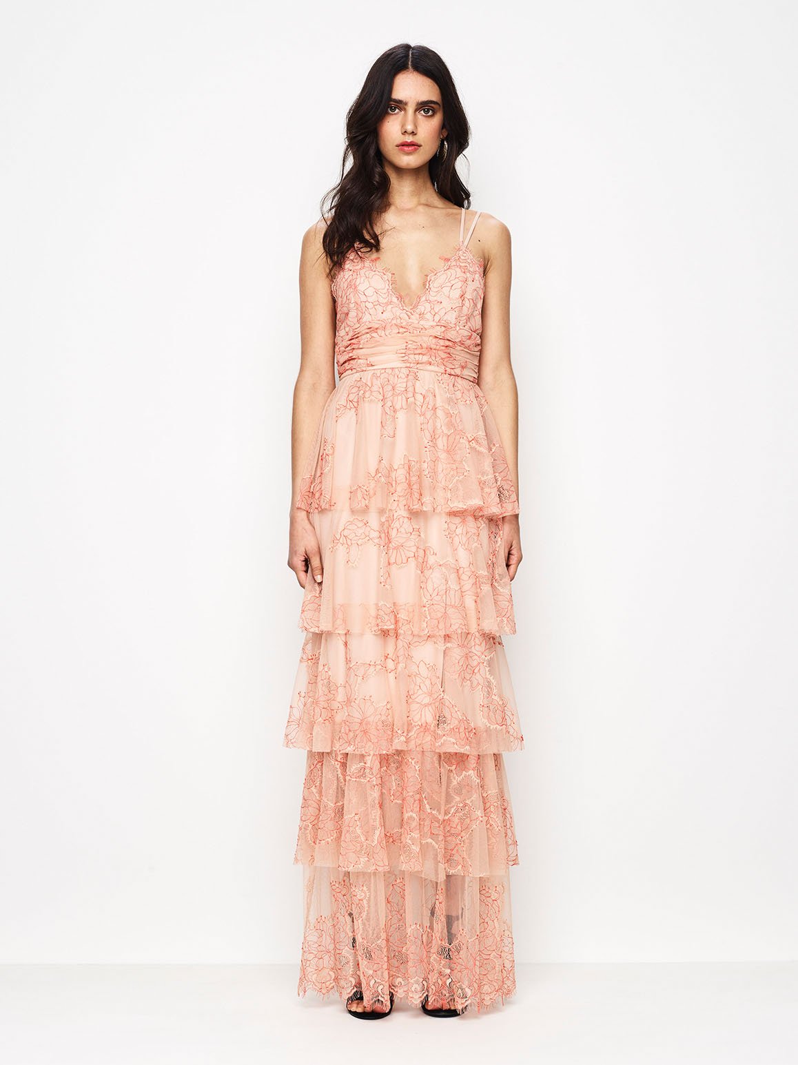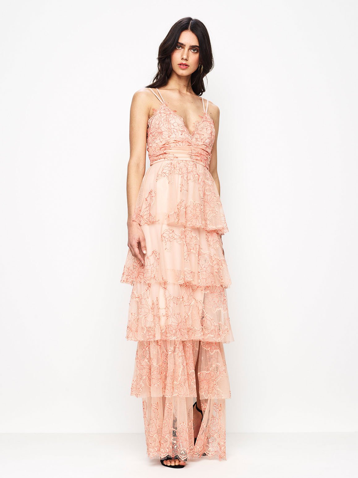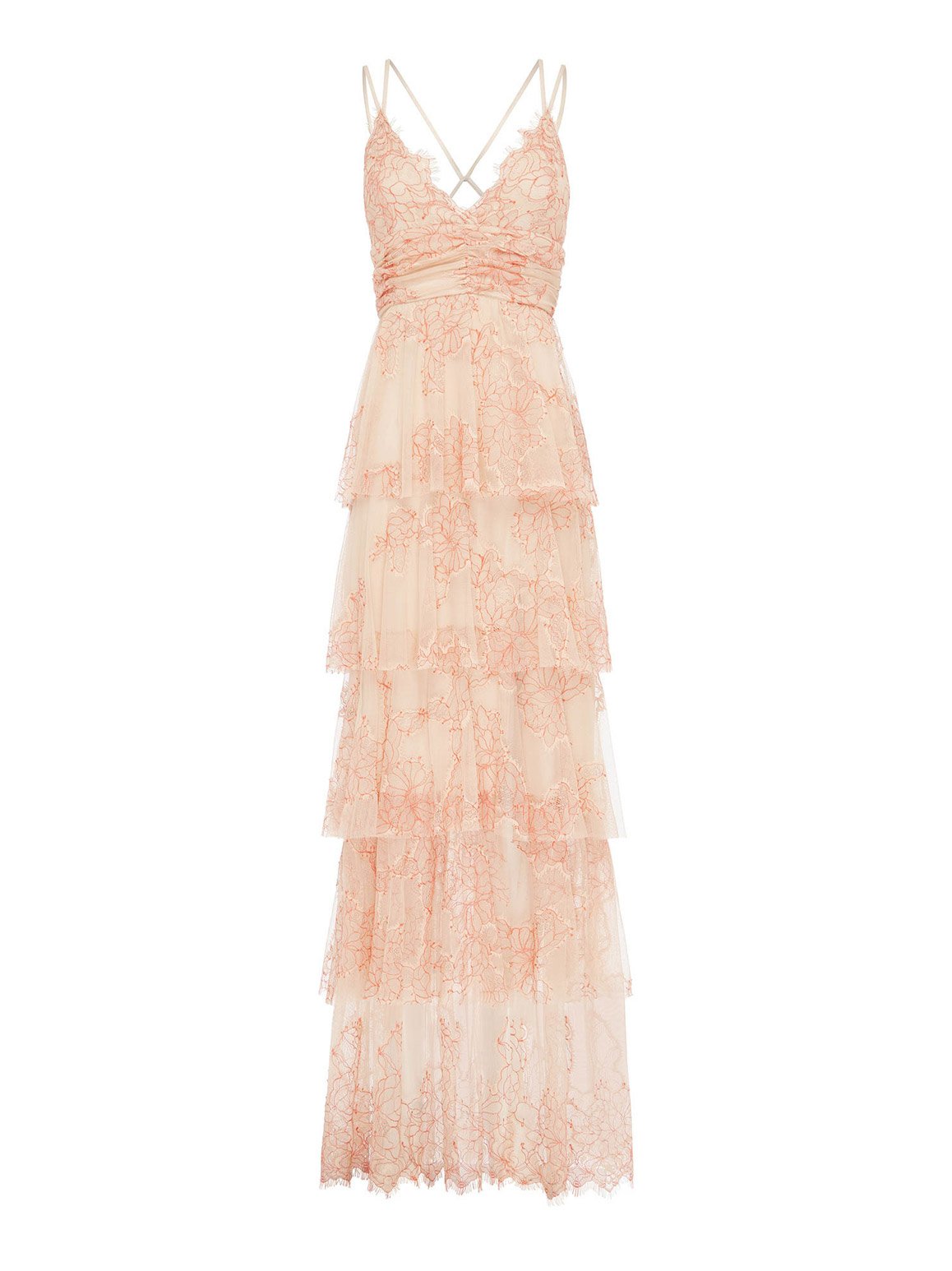 The Love is Love Gown is a maxi dress that grazes and sweeps the ground when you walk. The double shoe string straps create a pretty feminine vibe while the scalloped lace trim lines the neckline. The rouched waist draws the eye to the smallest part of the body while tiered layers of lace fall to the ground. Pair with a high heel.